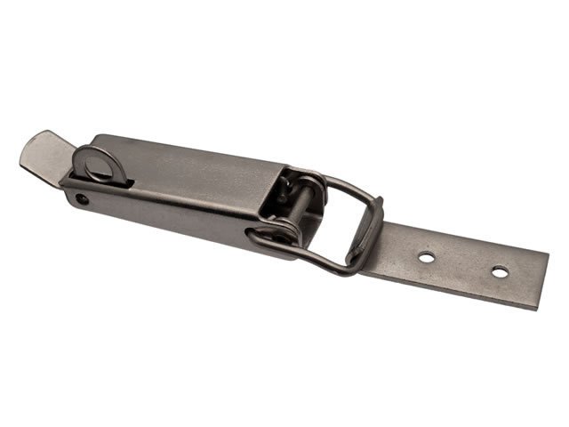 Draw latch for medium duty applications, produced from Zinc plated steel. Padlocable version to avoid unauthorised openings. Base plate with straight holes for screw or rivet to surface.