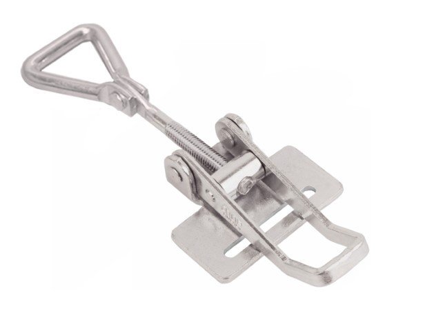 It is a Medium duty adjustable length latch with hinged triangle screw loop. Produced from Electropolished 316 Stainless steel which makes it suitable for demanding environments. Base plate with 26 mm slot for attaching a band (band is not included)