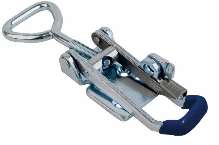 Medium duty adjustable length latch with triangle screw loop. Produced from zinc plated and clear passivated Steel for good corrosion resistance. Base plate with countersunk holes suitable for screw down or riveting to the surface applications. Padlocable with additional innovative feature- safety catch which protects from unauthorized or unintentional opening. Handle is coated in blue rubber for better grip and personalization. Wide range rubber colours are available so please send an inquiry. Fitted nylon friction ring ensure that Triangle screw loop remain positioned.