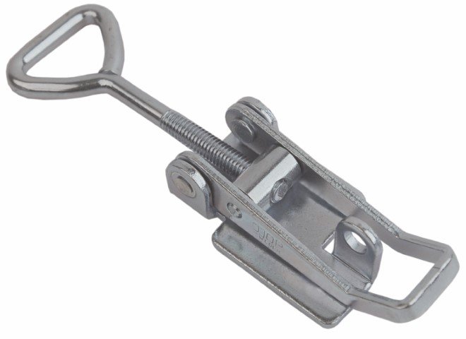 Adjustable length Over centre latch with triangle screw loop for medium duty applications. Made from Natural Steel. Base plate without holes suitable for welding applications. Padlocable latch helps to prevent unauthorized access.