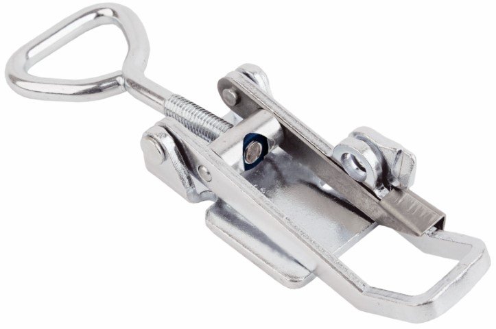Medium duty adjustable length Over centre latch with triangle screw loop. Made of Electropolished 316 Stainless steel which has better corrosion resistance compared to 304 Stainless steel. Base plate without holes- suitable for welding applications. Locable with secondary lock- safety catch which protects against unauthorized and unintentional opening. Fitted nylon friction ring ensure that Triangle screw loop remain positioned in place.