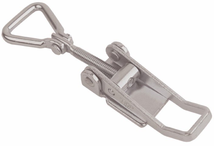 Stainless steel latch Medium duty adjustable length Over centre type with hinged triangle screw loop. Manufactured from Electropolished 316 Stainless steel with better corrosion resistance compared to basic 304 Stainless steel. Space saving Base plate without holes suitable for welding to the surface applications.