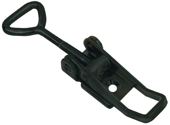 Medium duty adjustable Black color military latch with triangle screw loop. Made of Zinc plated with black color passivated Steel. Black color or olive drab green passivated products are widely used for military applications. Narrow space saving Base plate with 80 degrees countersunk holes suitable for tight space and screw down or riveting to the surface. MOQ 100 pcs.
